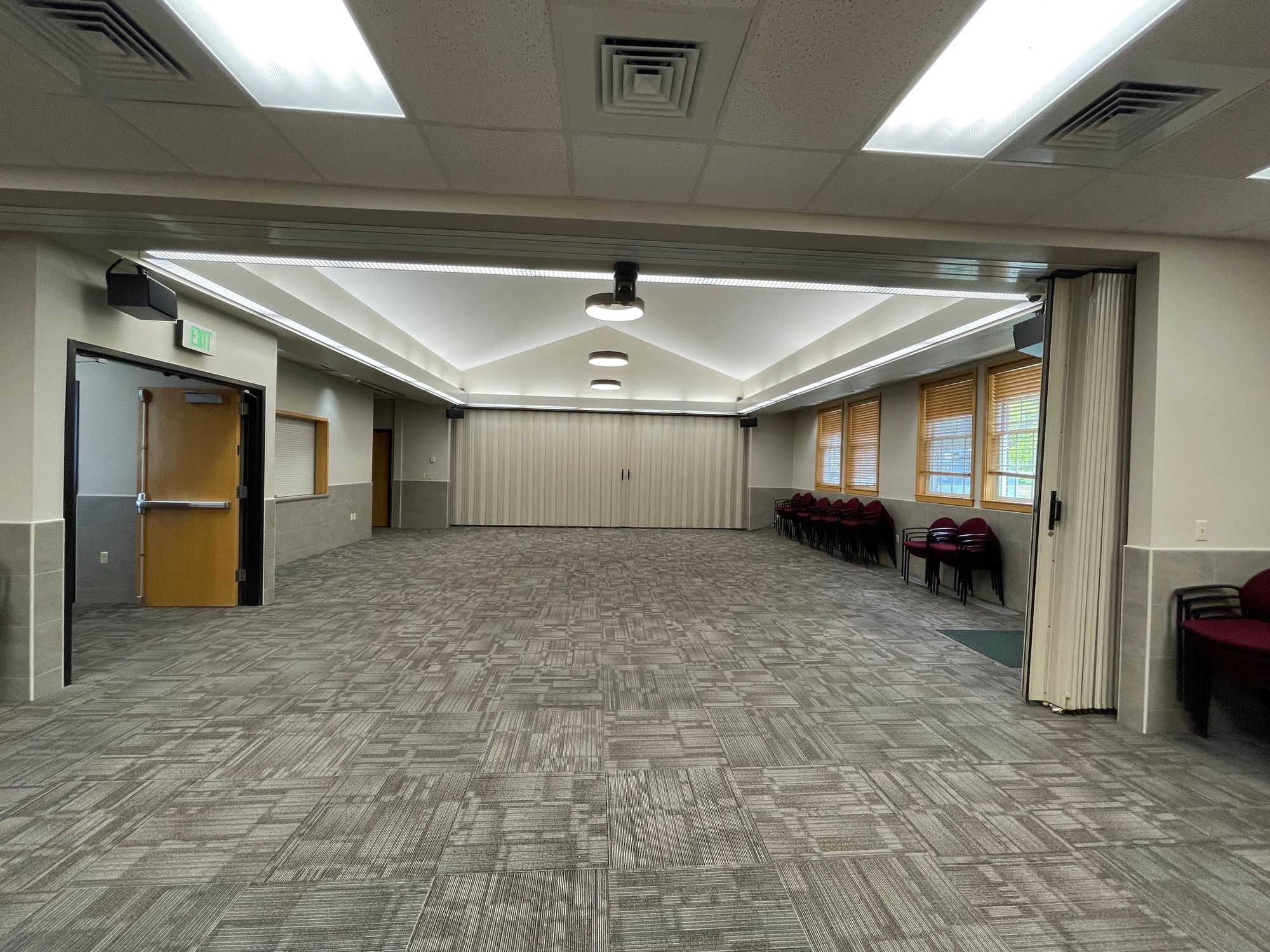 The upstairs has a large gathering area. There are tables and chairs available for your use. A kitchen facility is available just off this room. Restrooms are also available.