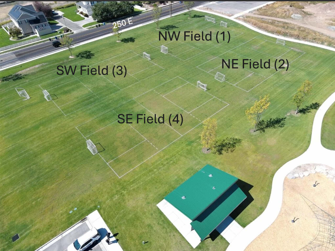 A large, open field spacious enough for 4 full-size soccer fields. *City does not offer the rental of goals or sporting equipment.
